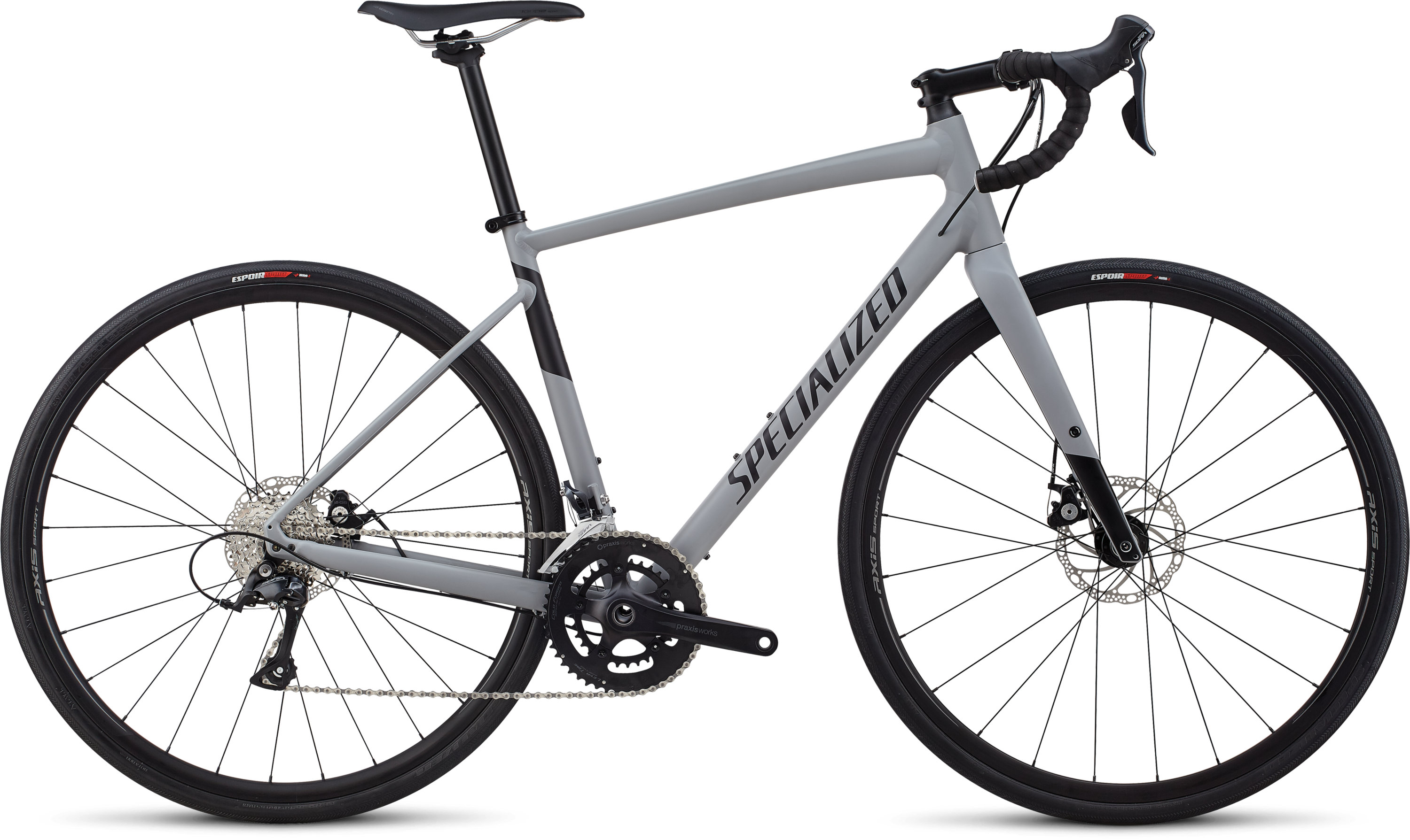 The 2018 Specialized Diverge E5 Sport in Grey. So youll find a Shimano Claris 8-speed group set hassle-free mechanical disc brakes the fan-favorite Power Sport Saddle and a durable Axis Sport Disc wheel set thats been cased in our fast-rolling 35mm Roadsport tyres with built-in flat protection. The 2018 Specialized Diverge is a bike series to be reckoned with.